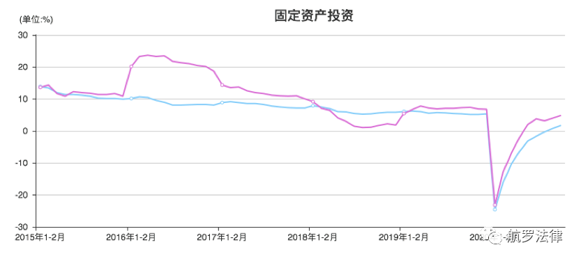 从国家统计局统计数据来看(图中蓝色线表示非国有及国有控股投资情况,图中粉色线表示国有及国有控股投资情况),2015年度固定资产投资同比增长率为10%和10.9%,2016年度固定资产投资同比增长率为8.1%和18.7%,2017年度固定资产投资同比增长率为7.2%和10.1%,2018年度固定资产投资同比增长率为1.9%和6.8%,2019年度固定资产投资同比增长率为5.4%和6.8%。
